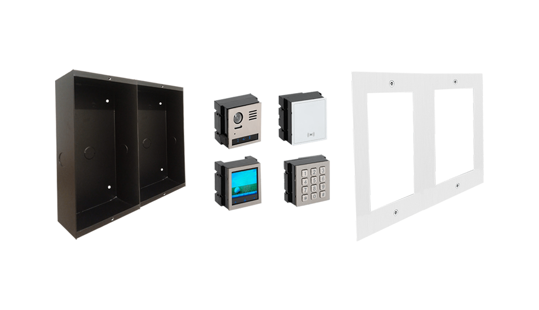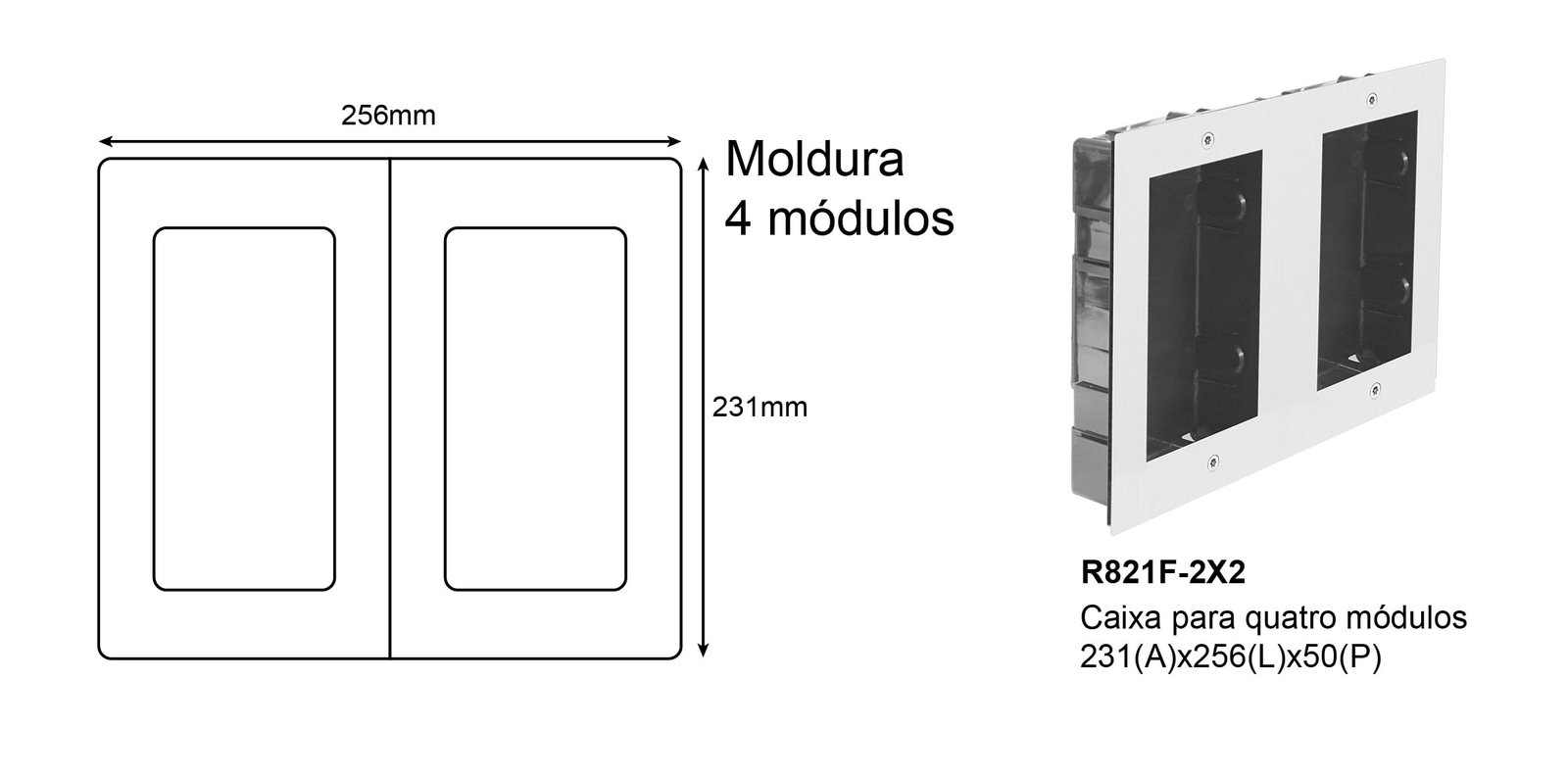 Moldura 4 módulos para instalação de encastrar compatíveis com todos os equipamentos da gama 2Easy. Configuração diversificada com ajuda dos módulos R821.